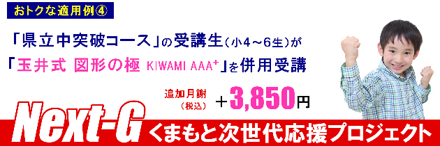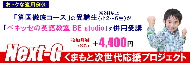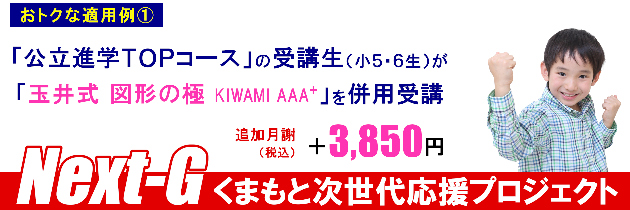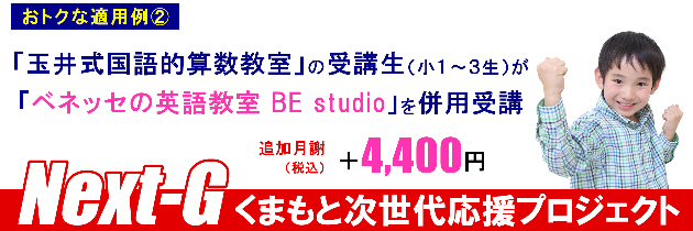 熊本ゼミナールでは,こうした社会状況の変化に対応するとともに,熊本の将来を担う子どもたちの可能性の芽を引き出すため,『くまもと次世代応援プロジェクト~Next-G』に取り組んできました。そして今年,一人でも多くの子どもたちに,その持てる可能性に気づき,その個性を伸ばす契機としていただくため,この取り組みをすべての小学生対象のコースに拡大することとしました。小学生専用の能力開発コースである『玉井式国語的算数教室』『玉井式図形の極 KIWAMI AAA+』,英語でのコミュニケーション力を伸ばす『ベネッセの英語教室 BE studio(ビースタジオ)』だけでなく,『算国徹底コース』や『公立進学TOPコース』,『中学受験コース』や『県立中突破コース』といった受験コースまで,複数のコースを受講される場合,2つ目以降のコースについては,月謝半額で追加受講していただくことができます(※月謝額が少ない方のコースが半額となります)。