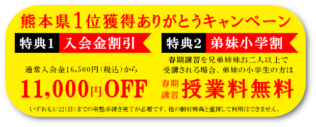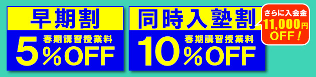 ※早期割特典は,3/12(木)までにお手続き完了ください。同時入塾割特典は,3/22(日)までにお手続き完了ください。他の割引特典と重複して利用はできません。